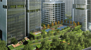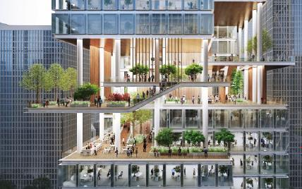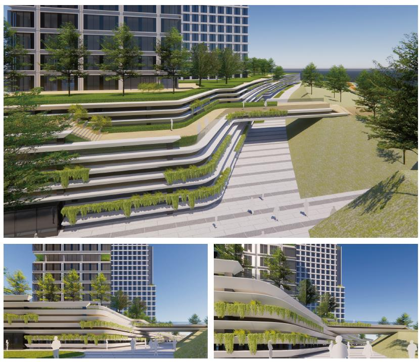 建筑组团中央,通高两层的“城市客厅”成为思想碰撞的熔炉;三层空中云台通过有盖廊道串联楼宇,形成全天候的公共步行纽带;而垂直分布的空中花园与地面绿脊,共同构建出覆盖率超30%的生态绿脉。