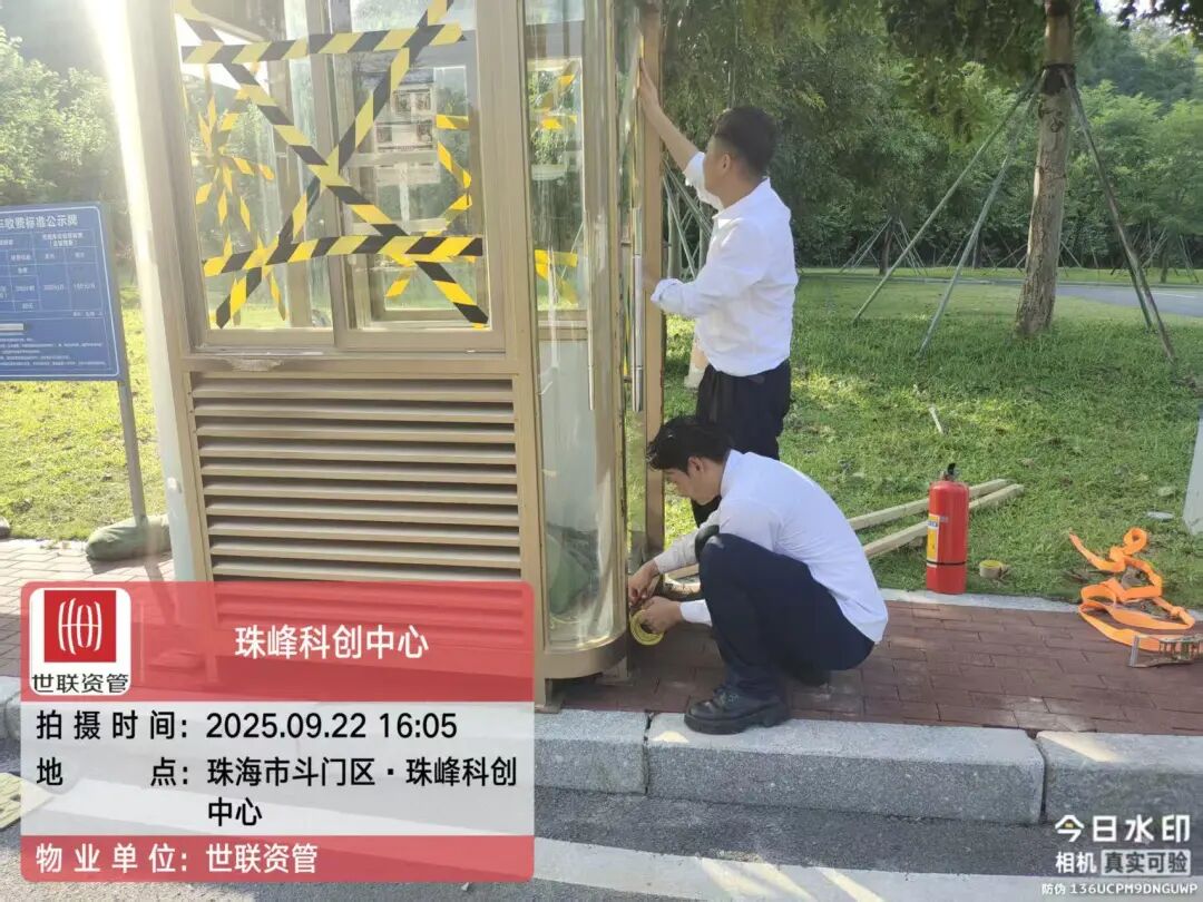 对珠光集团旗下园区内的楼宇广告牌、生命通道、应急避难场所等防汛防风部位的隐患全面排查和清理。要求应急人员全部到岗到位,对防汛物资,应急物资准备情况以及值班、抢险队伍备勤情况和园区建筑物排水系统、消防系统、监控系统、外立面及门窗系统进行全面排查。做好园区企业客户的安全保障工作,同时对园区企业和商户尽数告知和劝导,坚决落实“五停”措施,预备应急避难场所。