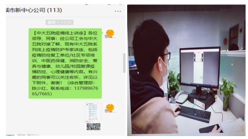 为进一步做好疫情防控工作,提升职工疫情防控知识及提高心理调适能力,城市新中心公司工会与中大五院健康管理科联系对接,组织职工收听中大五院疫情防护系列专家讲座。